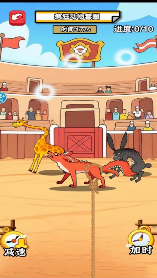 2、套圈模式中,手指滑动屏幕绘制绳索轨迹,瞄准移动的动物抛出,确保精准套中目标。