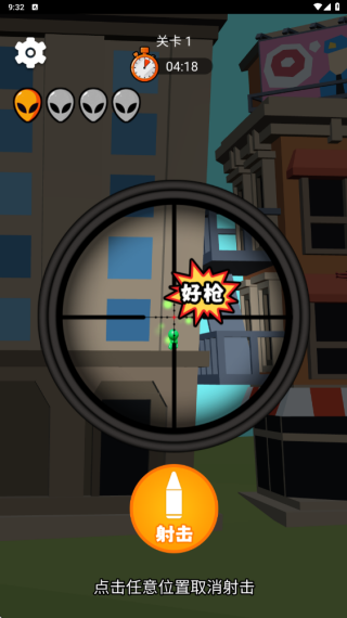 3.在找到外星人之后,玩家可以点击狙击图标,将准星对准外星人的身体再次点击射击,将外星人击毙。