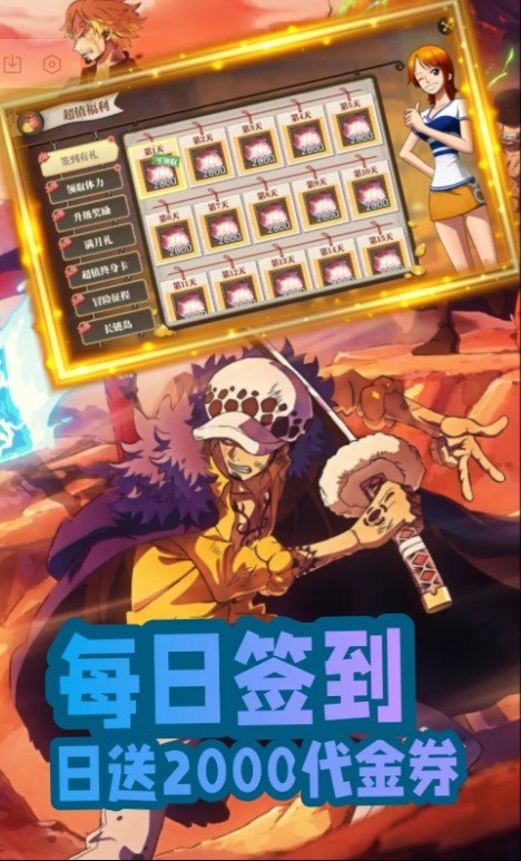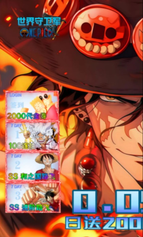 世界守卫军(0.05折日送2000代金券)是一款正版横版海贼卡牌游戏!游戏内真实还原了路飞一路成长的历程,一路挑战各个关卡,收入各个动漫里面脍炙人口的人物作为自己的伙伴,一起征战新世界!新版百万代金版本强势来袭,首续充值0.05折,每日签到赠送2000代金券,爽玩停不下来;七天奖、新手狂欢、升级奖励、满月礼等大量福利活动,送超多充值卡、体力、抽卡等战力道具;这个海贼王卡牌手游,真的好玩!爱玩!