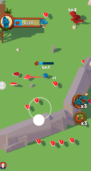 1、游戏初期,优先控制蓝色恐龙收集红色肉块,提升经验值升级。