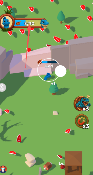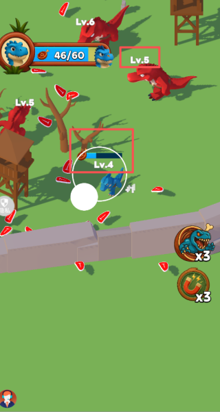 4、当等级提升至Lv.2后,可合理使用右侧的技能道具。例如使用恐龙攻击技能可一次性击败多个低等级恐龙,磁铁技能则能大范围收集肉块。