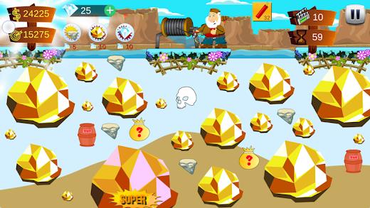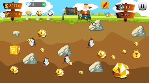 1、点击屏幕控制爪钩方向,在合适时机放下,抓取黄金、宝石或宝藏。