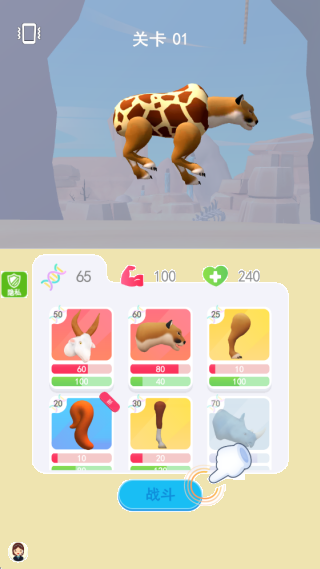 2.随后,玩家需要选择四肢以及头部等各个身体部位,组成全新的动物来参与关卡中的动物对决。
