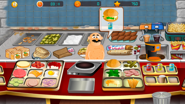 4.玩家需要根据客人的要求来进行美食烹饪,点击对应的食材来制作汉堡,并将汽水给客人,即可完成一个订单。