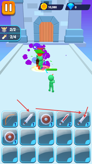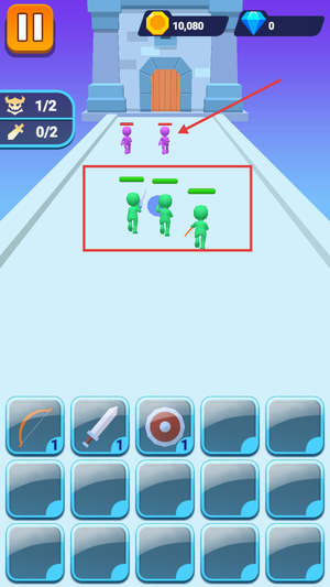 2、战斗中控制小兵走位躲避围攻,实时关注下方武器栏,合成相同道具提升战力,强化攻防力。