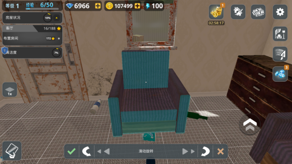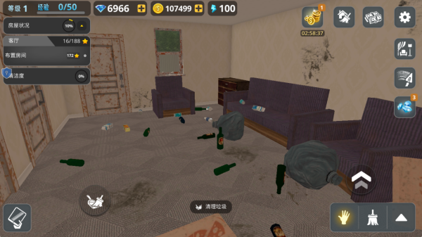 1、左侧屏幕点击可以呼出移动轮盘,右侧控制各类交互按钮,清理房间垃圾,开启你的建造之旅吧。