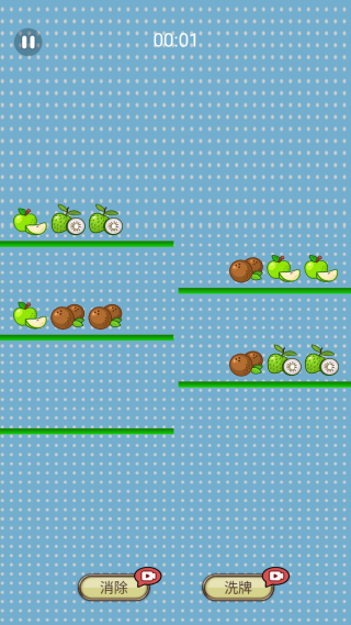3、点击一个水果后滑动与相邻水果交换位置,形成三个及以上同色横/竖线即可消除;无有效消除时自动回弹。四个一样的放在一起,水果就会被消除,为你赢得分数。