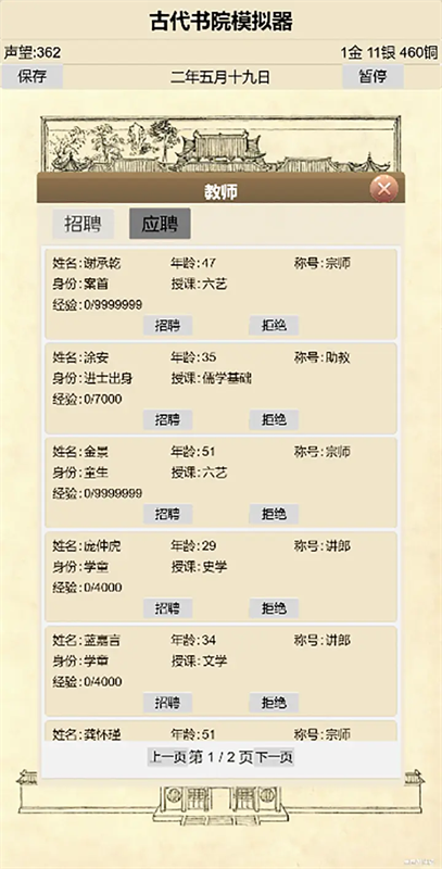《古代书院模拟器免广告破解版》这个版本是已经破解过的版本哦,满足了每位玩家的需求,游戏的玩法很简单,只要经营好自己的书院就可以了,在一段时间内可以开启书院招生,门生才气和名气属性越高,越容易中榜,中榜后可获得朝廷奖励,殿试中榜还能进入庙堂封官哦,能很好的提升书院的知名度!