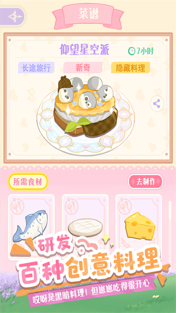 【灵感厨房】自由搭配 研发百种创意料理 快为三个可爱的崽崽烹饪美味料理吧,吃饱饱才有力气学习和外出游玩噢。收集各式新鲜食材,自由组合搭配,数百种世界各地的独特美味佳肴等你探索,更有机会触发惊喜隐藏料理噢。