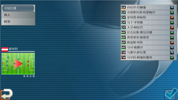 4.深度的球队管理:每场比赛前,你都可以针对对手进行调整。球衣: 为主客场选择两套最新球衣。换人: 调整首发阵容,每名球员都有能力盘和详细数据(GK守门员,DF后卫,MF中场,FW前锋)。阵型: 提供4-4-2、4-3-3、5-3-2等多种选择,并可调整阵型的攻击性。通过闪烁的方向键进行下拉和切换。