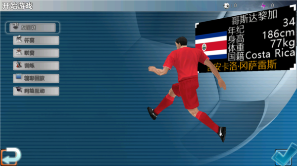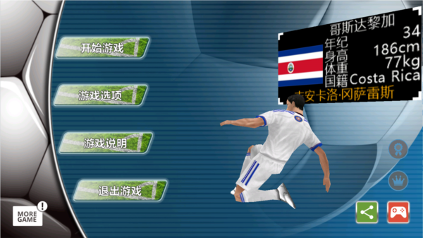 2.易于上手,精通有深度:通过与AI队友把握时机进行配合,就能打出行云流水的进攻和精彩的射门。在主菜单的“游戏说明/帮助”中可查阅详细操作指南。操作采用国际流行设定:1个方向圆盘控制移动(内圈常速,外圈加速),4个按键分别负责短传、长传、射门和特殊带球。