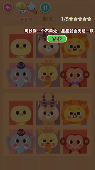 1. 通过手指触控点击发现两幅图片中的不同之处,正确找出所有差异即可通关并获得星级评价。