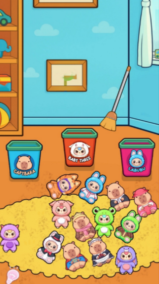 3、整理关卡中,先将地毯上的玩偶按图案分类放入对应收纳桶,再用扫把清扫污渍,按分类清扫顺序推进。