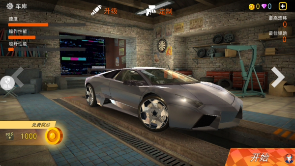 1.进入游戏主界面后玩家可以点击画面两侧的箭头按钮来切换汽车,点击“开始”进入比赛。