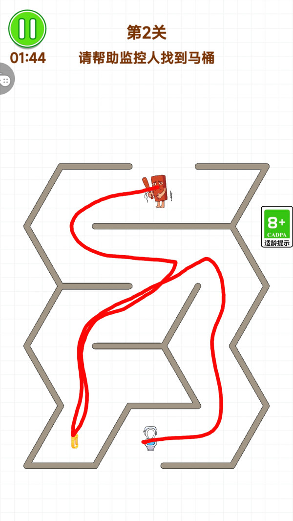 2、用指尖滑动屏幕,为监控人画出通往马桶的具体路径,过程中需避开迷宫中的死路与障碍,确保路径连贯可行。