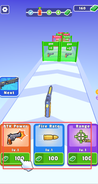 3、开局前可点击选择升级攻击威力、射击速度、射程等属性,强化自身战力,为闯关奠定基础。
