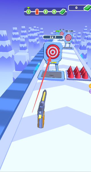 1、点击操控枪支向前移动,瞄准战场目标进行射击,突破各类障碍推进闯关进度,完成基础战斗任务。