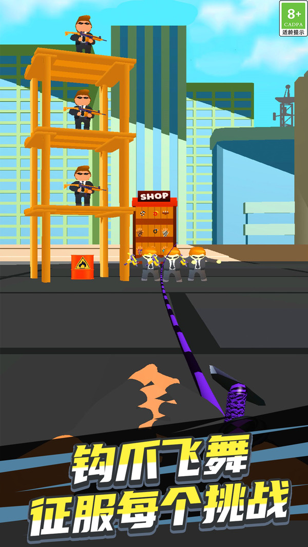 1、拖拽屏幕控制绳索摆动,点击屏幕固定锚点,松手释放绳索攻击敌人,精准命中即可快速制胜。