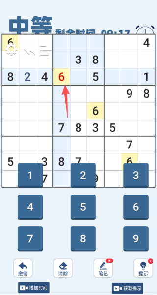 3、排除法确定该空格唯一答案为6,点击底部数字6填充。
