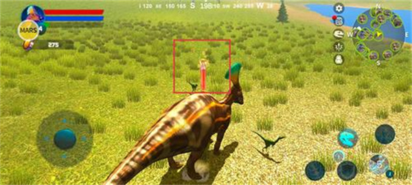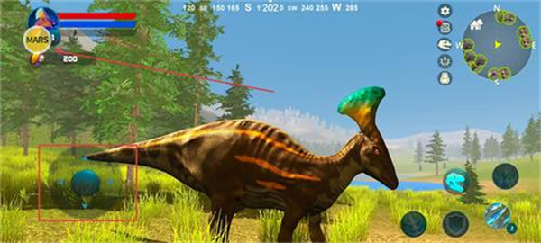 1. 玩家通过虚拟摇杆控制恐龙移动,需要不断寻找食物和水源来维持生命值并促进自身成长进化。