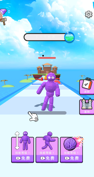 1、进入游戏后操控萌系毛线人开启跑酷闯关,可先查看皮肤基地等功能板块,熟悉游戏界面。