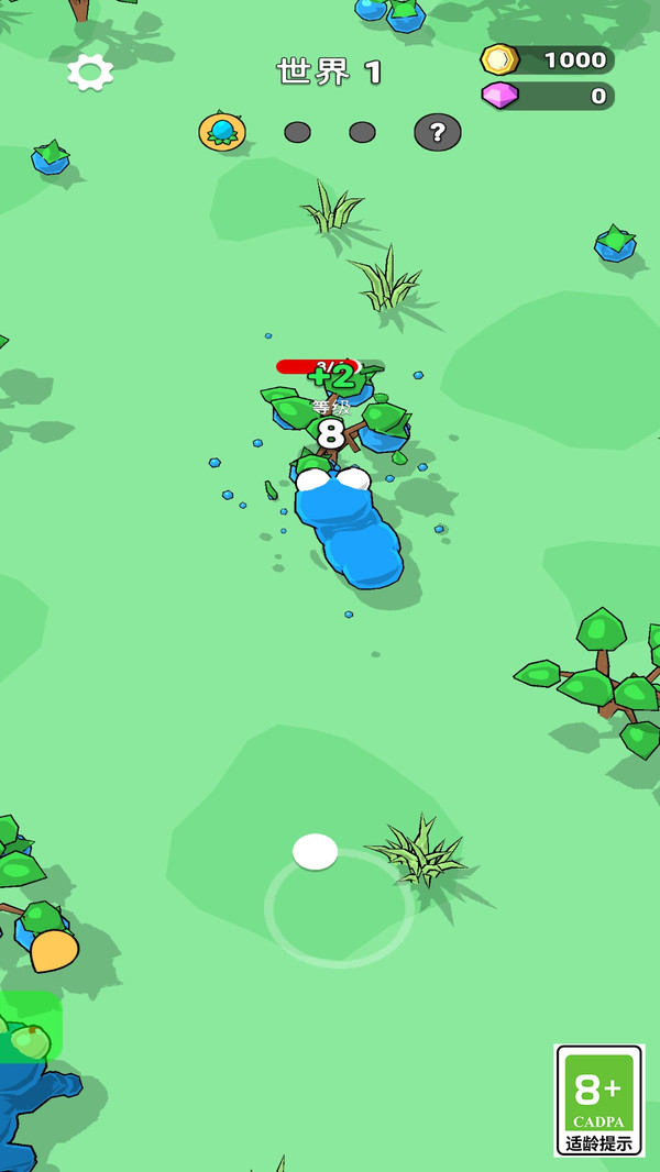 2、在场景中不断吞噬体型更小的生物与宝箱,积累能量提升自身等级,逐步壮大体型。