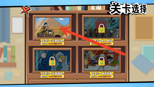 1、进入游戏后,首先选择你要挑战的关卡,初始玩家只能从第一关卡开始挑战,开启火柴人的逃亡之旅。