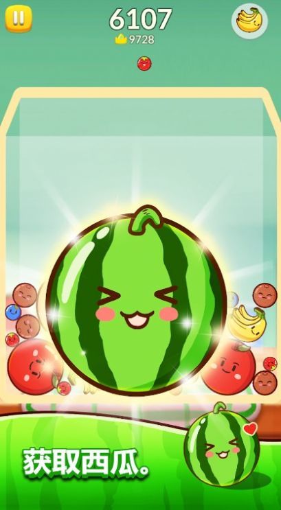 2.创新的合并玩法:通过简单的合并操作,将相同的水果拼合在一起,创造出更大的水果,体验合成的乐趣。