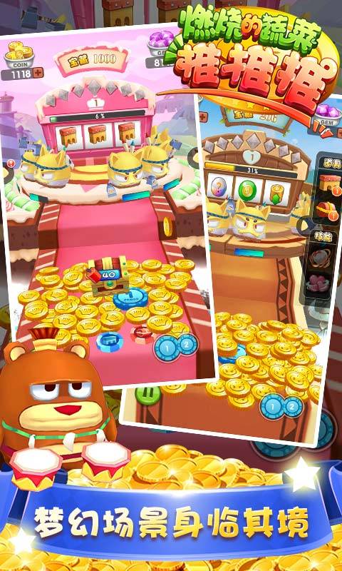 1、建立在《燃烧的蔬菜》基础上的3D卡通推金币游戏;