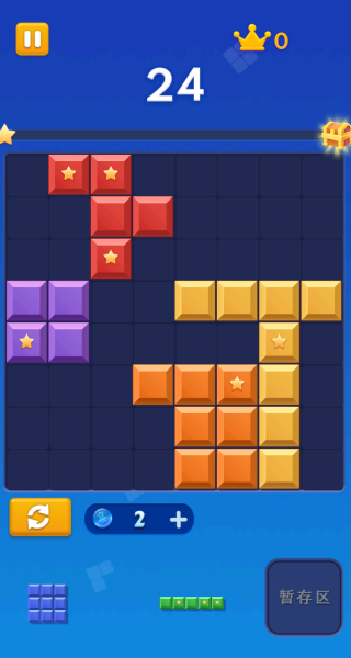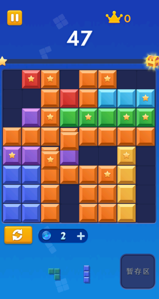 2、右侧黄色方块群中有星星元素,可先把黄色方块旁的星星与同色方块拼接,形成带星星的消除组合,不仅能消除黄色区域,还能触发星星的额外得分效果,同时也能让左侧紫色方块区域的布局更宽松。