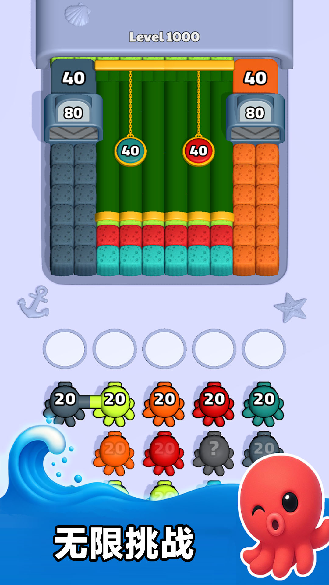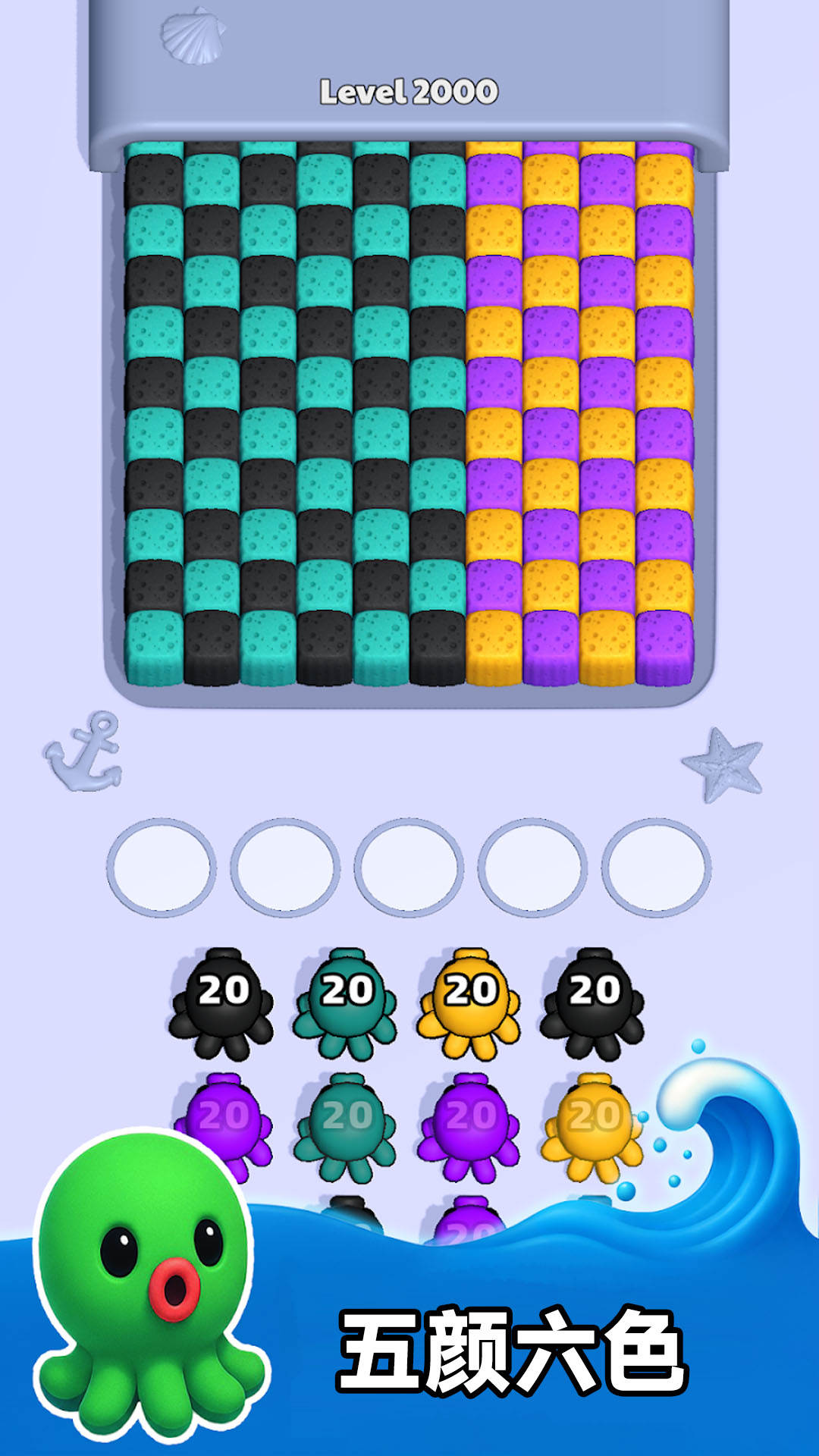 4、消耗所有的章鱼来完成关卡任务,最后不能剩余任何方块,玩家要使用合适的顺序进行消除。