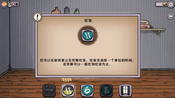 4、在厨房选择 “吃饭” 操作时,需注意该行为消耗时间单位,可连续使用至角色饱腹,优先保证饱腹状态再进行其他活动。