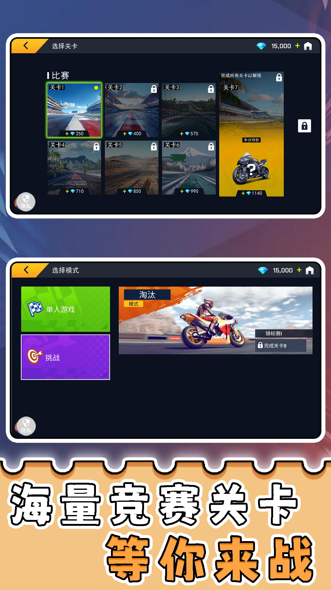 3、操控摩托车灵活应对赛道弯道与障碍,以最短时间完成比赛,争夺关卡高分与排名优势。