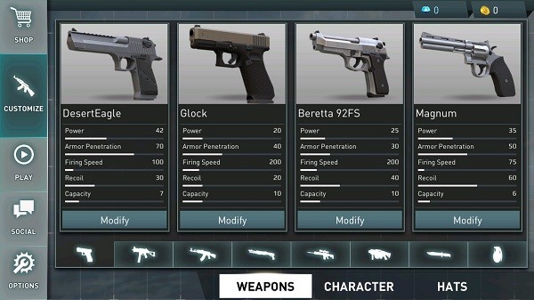 2、武器库内的枪械选择丰富,有冲锋枪、自动步枪、霰弹枪、狙击枪以及近战武器和手雷。