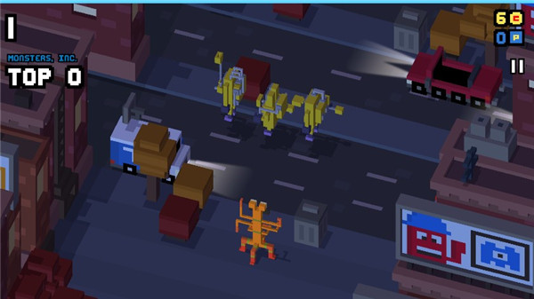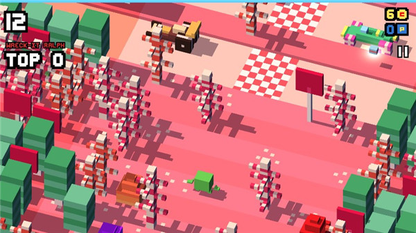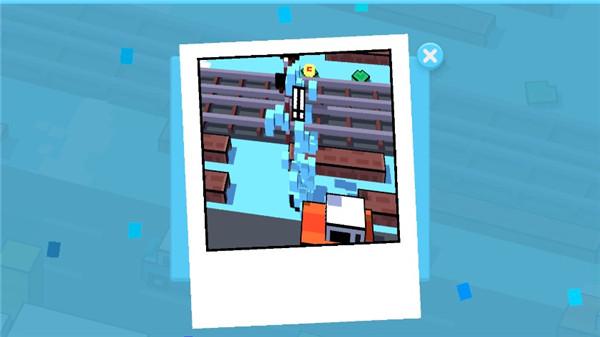 1、场景中设有安全岛、木箱等临时掩体。此外,可以收集路上的魔法道具,如“护盾”(抵挡一次撞击)、“冻结”(暂停所有车辆)等。