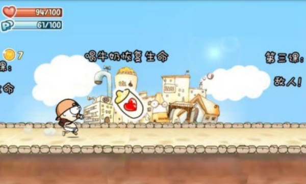 2.在挑战中需要注意的是你如果遭遇到感叹号的障碍是需要合理的使用技能躲避的,而且在画面的左上角则是玩家当前的生命值,你要拾取牛奶并恢复自己的生命。