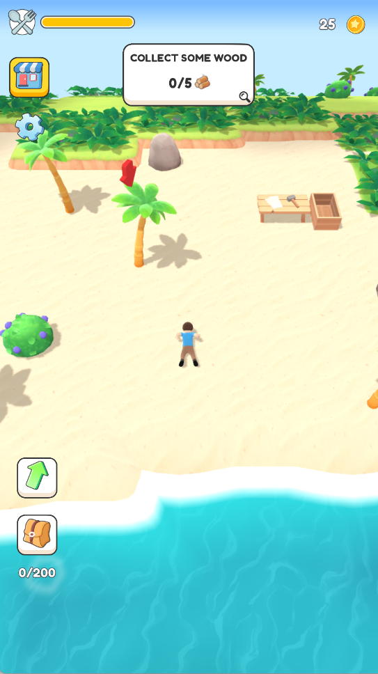 1、点击屏幕中间按钮控制角色移动,优先走向树木等资源点,开启初期资源收集,为后续建设奠定基础。