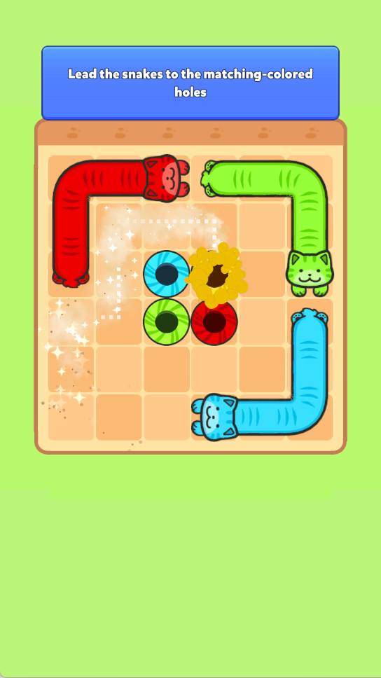 1、点击屏幕操控液态猫咪移动,遵循颜色匹配规则,仅能引导猫咪进入相同颜色的出口完成逃脱。