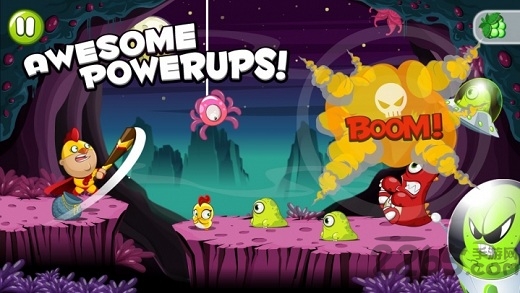 1. 这款游戏的画风和氛围是轻松带点幽默的卡通,小鸡、怪兽、超人鸡爸的造型都很萌,画面色调轻快、简单。