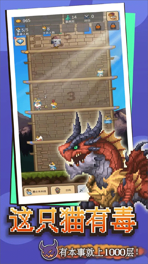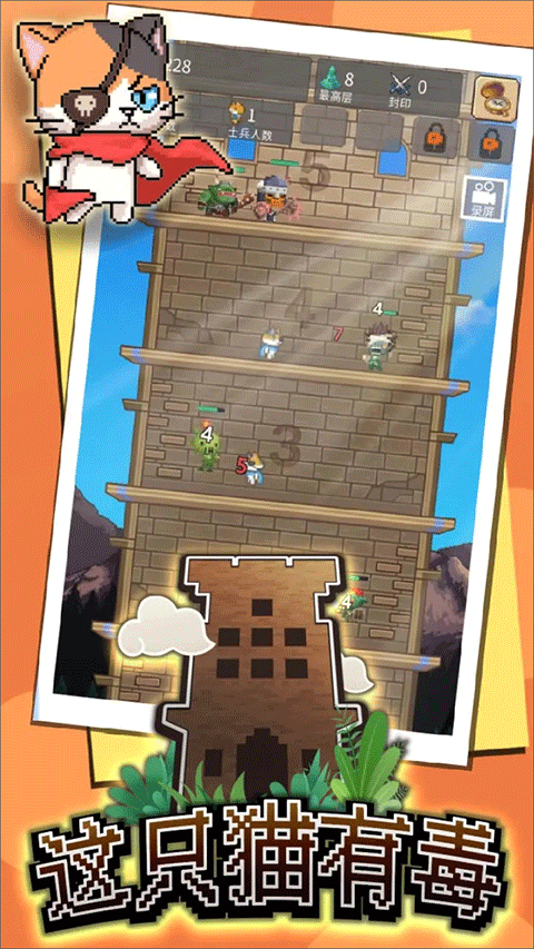 这只猫有毒以其创新的勇士召唤机制和引人入胜的爬塔挑战,为玩家打造了一场别开生面的冒险盛宴。玩家在游戏中召唤勇士,解锁兵种,获取装备,在不断的变强过程中突破1000层天牢,救回公主。游戏内容十分的有趣,多个游戏场景可以挑战,多样化的玩法,丰富的游戏内容,经典的闯关挑战。