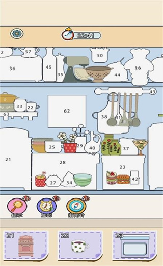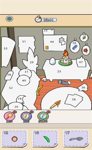 1、仔细观察每个物品的轮廓和编号,它们是你解锁完整图片的线索。