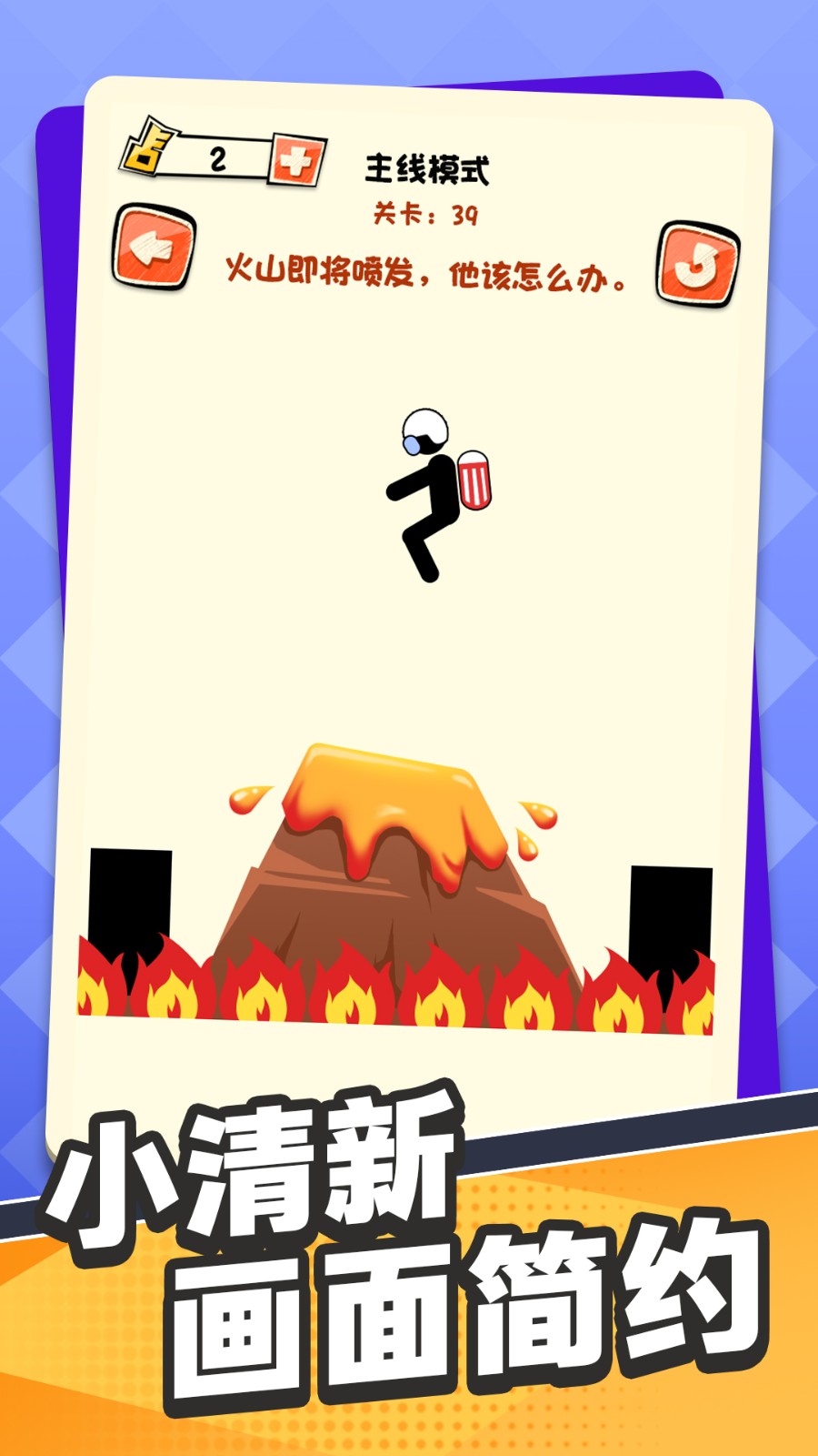 1、核心玩法为画线解谜,玩家在屏幕指定区域绘制线条,生成具有物理特性的防护结构或道具,抵御落石、岩浆、陷阱等危险,保护火柴人安全。