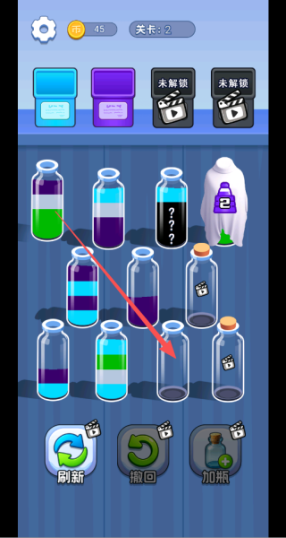 3、合理利用加瓶道具,当现有瓶子无法满足分类需求时,解锁临时空瓶,打破空间限制。
