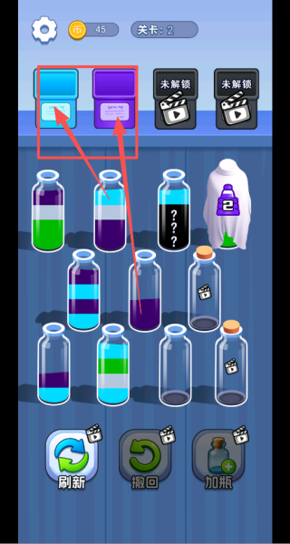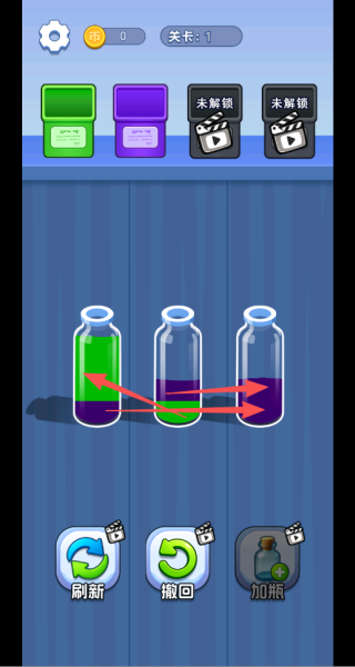 4、卡关时点击下方刷新,撤回或加瓶功能按钮,调整操作策略,助力完成颜色分类任务。