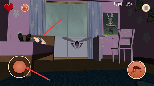 2、用左下角虚拟摇杆控制蚊子飞行,保持低空移动,慢慢靠近房间内的人类目标。