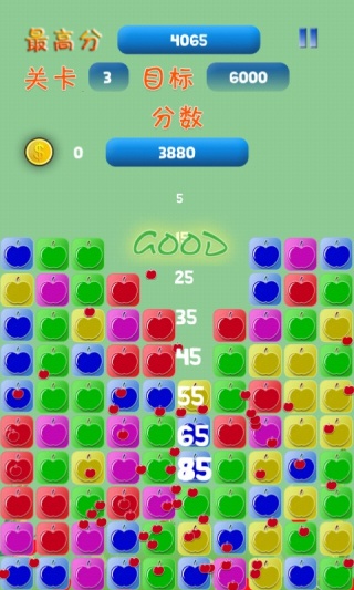 3.通过消除各种各样画面中同样颜色的苹果就能完成消除,你在进行闯关的过程中要尽可能的一次性消除大量的苹果才能够获得更高的分数。