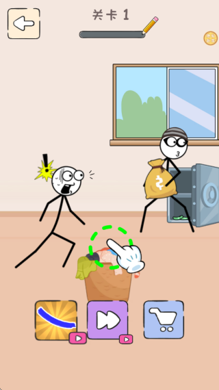 4.火柴人将会使用获取的拖鞋来对付小偷,本关卡即可成功闯关。点击右下的箭头按钮将可以进入下一个关卡。