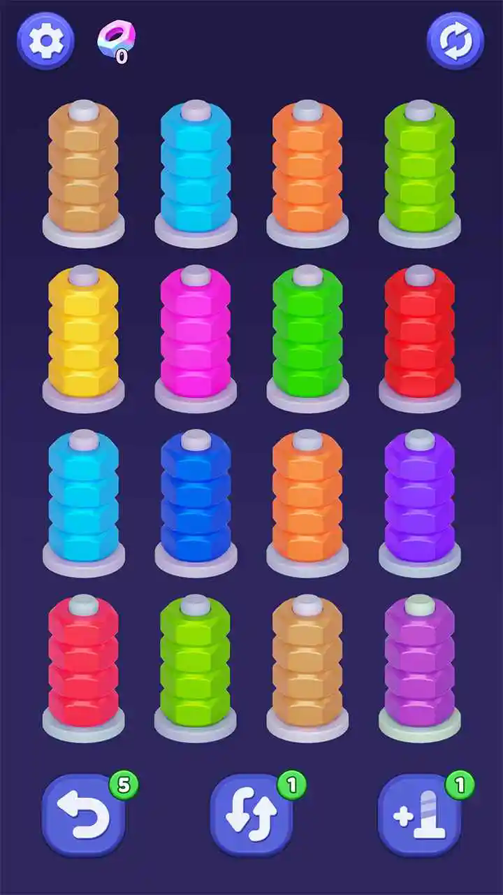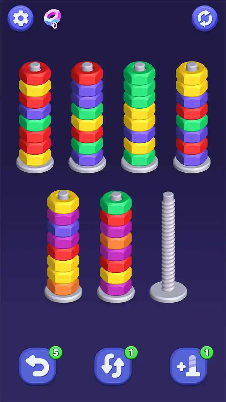 2、每颗螺丝由多层(圈)独立旋转的色环构成。你的目标是将每一圈都旋转至所有格位颜色统一,且该圈槽位被填满,该层即会锁定并亮起。