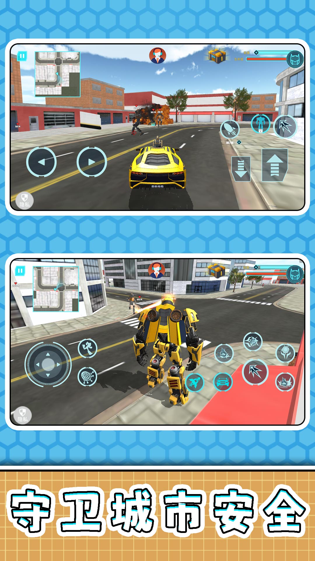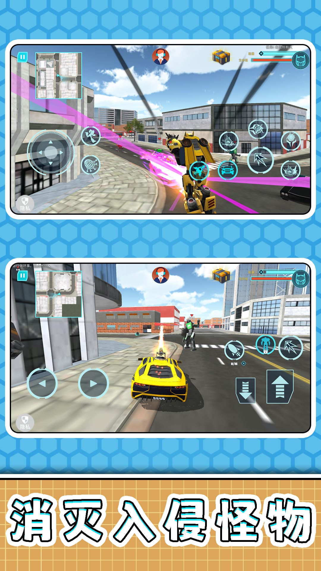 2、玩家操控可自由变形的机甲在城市中冒险,搭配多样武器击败敌人,兼具变身爽感与战斗刺激体验。