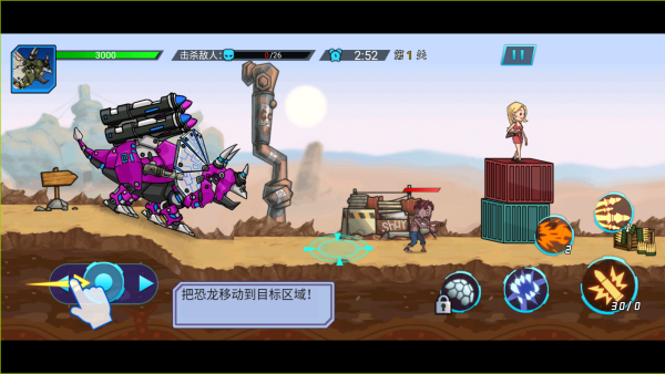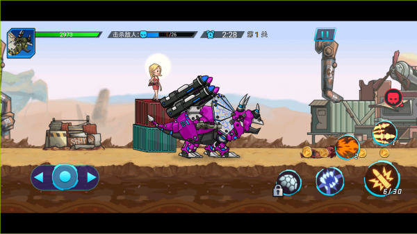 1.以2D卡通风格呈现,打造横版闯关世界,融合机械力量与史前巨兽元素,构建兼具科技感与野性魅力的视觉体验。